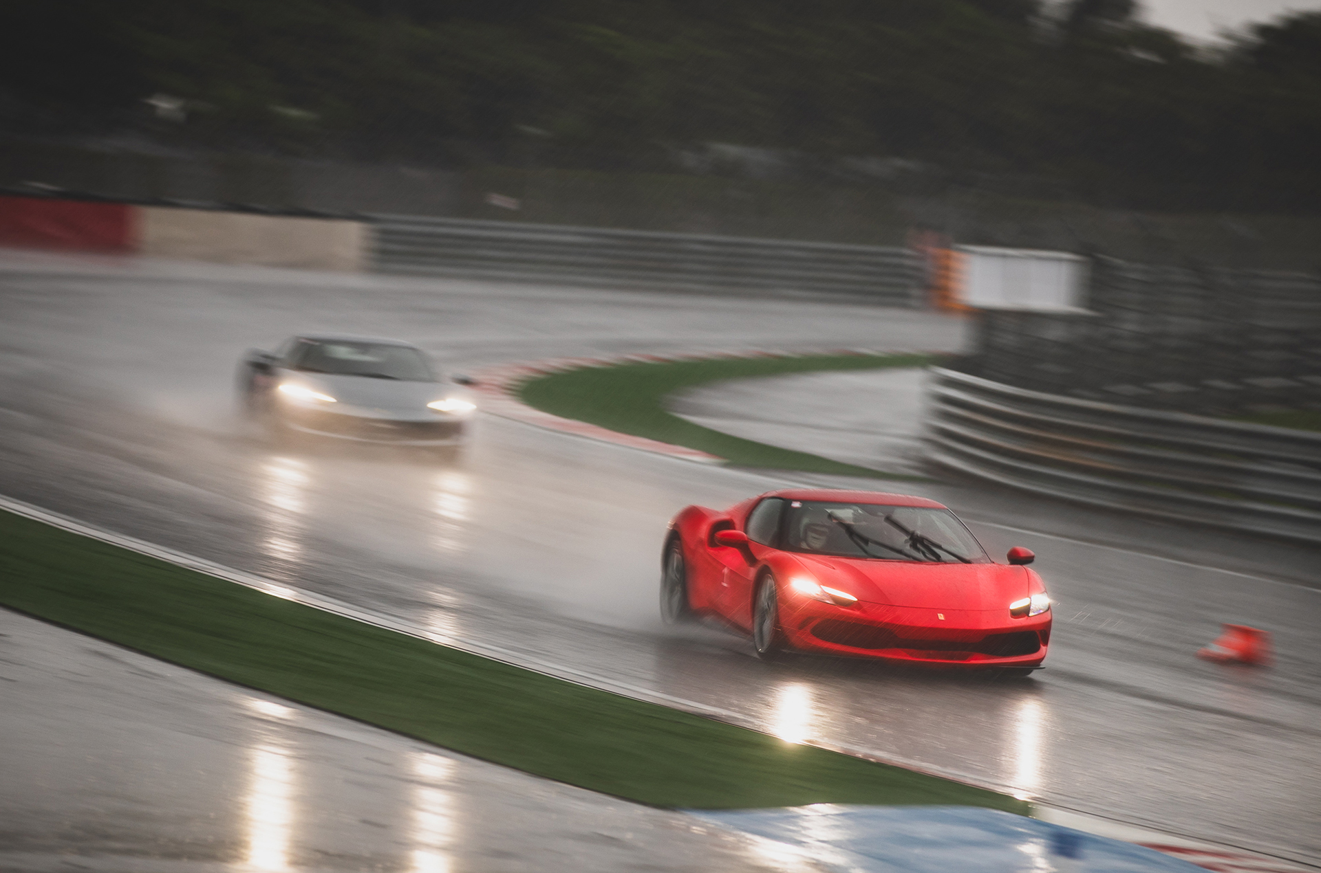 活動時恰逢梅雨季來臨,期間雖不時下著大雨,但每天早上再經由教練團隊評估,判斷是否可以安全無慮的上賽道體驗後,依舊在安全的準備措施下順利舉行。為避免雨天行在賽道上因激烈操駕造成車輛打滑,行前Ferrari 法拉利專業的售後服務團隊,會確保體驗車輛的胎紋和胎壓,保障行駛安全;也透過Ferrari Manettino專為濕滑地面所設計的Wet模式,讓參與的貴賓們能體驗到Ferrari 法拉利最先進且靈活的駕駛模式設定。