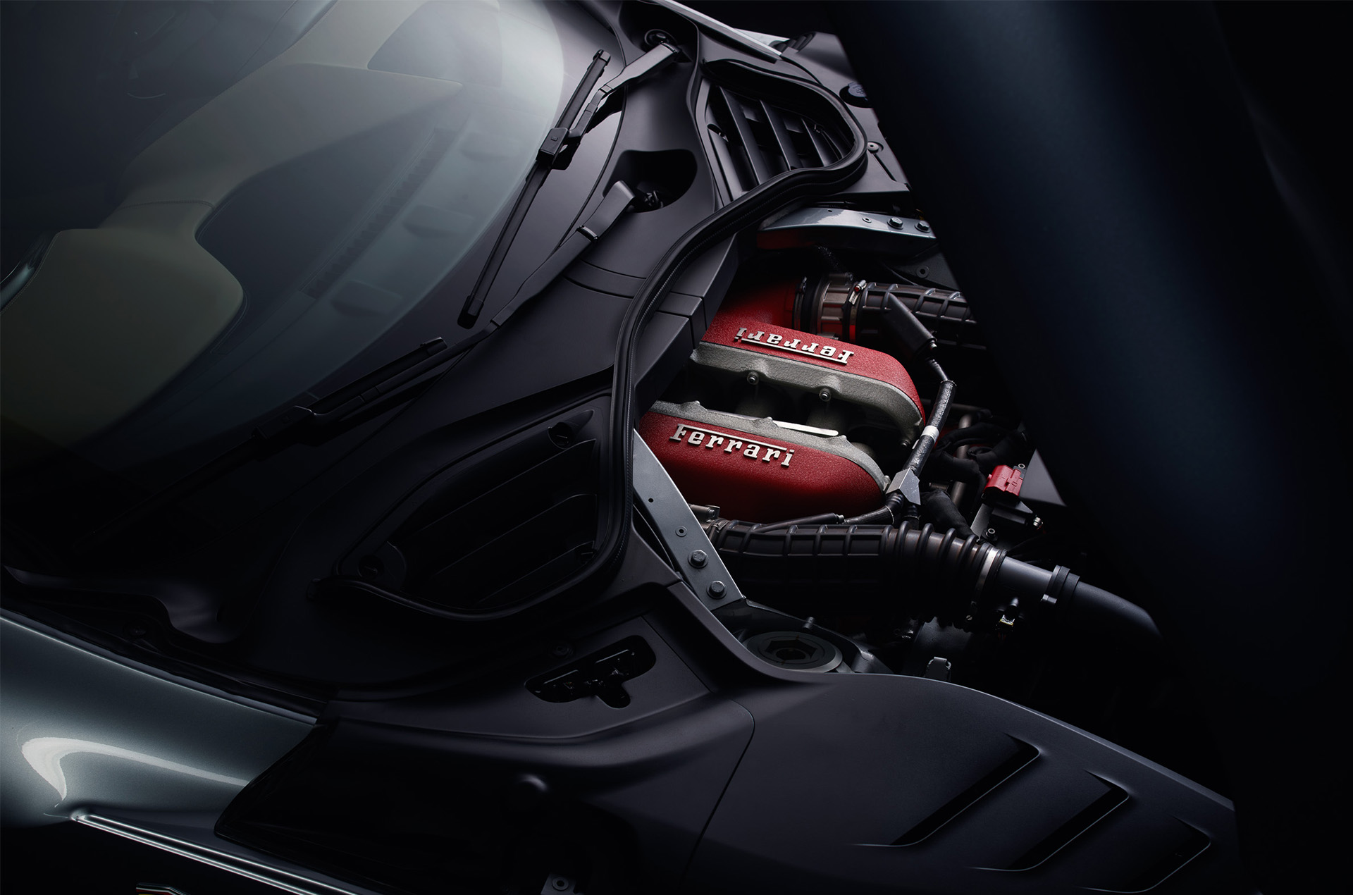 專為Purosangue優化的V12引擎,其725cv為標準輸出功率,在2000 rpm時便可釋放80%的峰值扭力,當轉速進入8250 rmp時,便能傾聽驚艷不凡的標誌性聲浪,此外,卓越的性能表現0-100 km/h為3.3秒,0-200 km/h 為10.6 秒。與其他中置引擎 Ferrari 一樣,Purosangue 的引擎橫跨於前軸,搭配八速雙離合變速箱於後軸,以此創造變速箱與差速器結合之聯合傳動器的配置,從而實現了49:51的最佳前後配重。