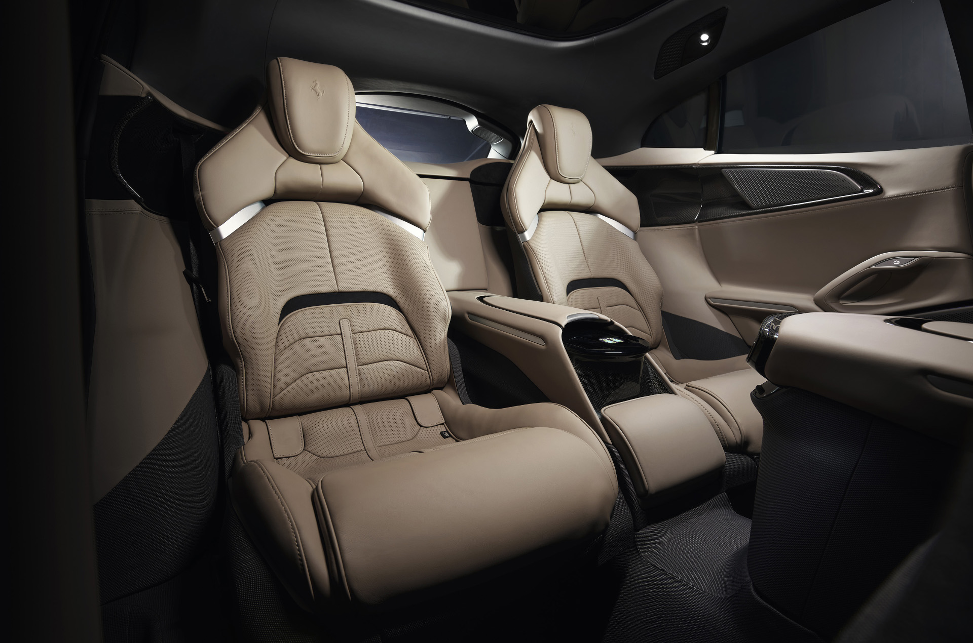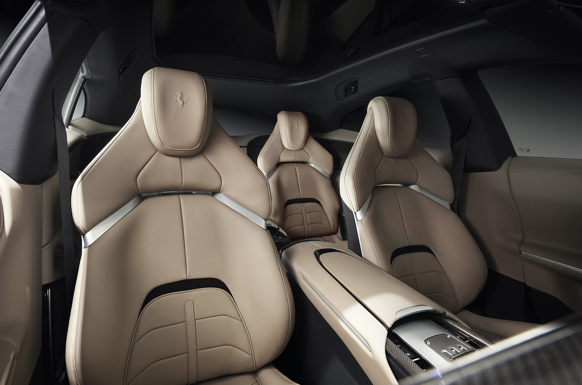 進入車內能立即感受到前所未有的寬敞空間,儀表板也極具創新,環繞式座艙設計將兩個駕駛艙合二為一,取消中央顯示螢幕,取而代之的是副駕座艙的獨立螢幕,與駕駛座艙的顯示螢幕完美呼應,使副駕擁有身歷其境的駕駛體驗,內裝的精美雕塑設計增添超跑感受,所營造的環繞感撲面而來。Purosangue可以舒適的容納四名成年人,座椅設計上也注入了大量的心血,纖細且極度舒適,具備加熱、降溫以及通風功能,優雅的金屬嵌飾呼應60年代的經典 Ferrari。行李廂能夠容納大型行李,可單獨折疊的後排座椅更能進一步提高容量。