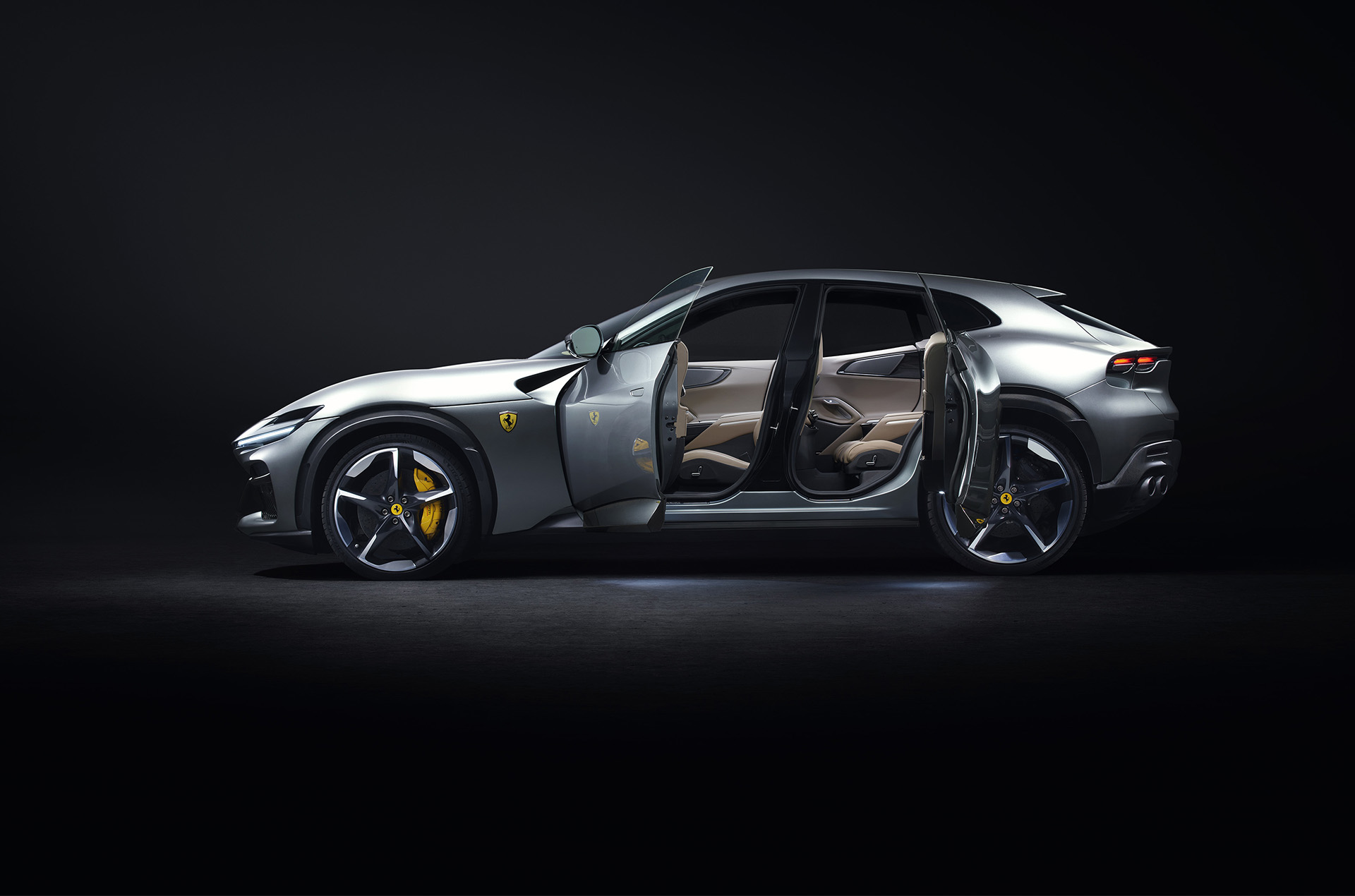 Purosangue不僅是Ferrari有史以來第一輛四門跑車,也是首台配備後鉸鏈式車門的車型,前後門開啟時像手臂一樣打開,邀請您進入,Ferrari 稱之為「迎賓車門」,不僅蘊含精妙的視覺效果,在使用上讓進出更輕鬆。另一巧妙的設計在於後門開啟按鈕,隱藏於腰線突起處,使Purosangue外型宛如一輛雙門轎跑車。