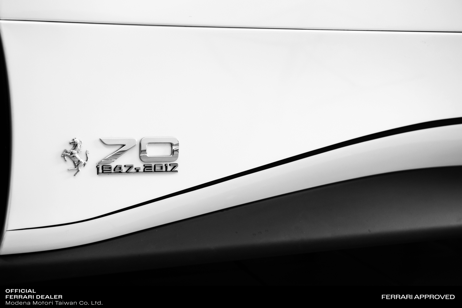 - 向 1984 年白色 Ferrari 經典超級跑車 GTO (288 GTO) 致敬,不只用上了最能代表賽車的 Bianco Italia 白色三層烤漆,還在跑車化側裙的上緣,加上與 GTO 神似的 Nero 1250 黑色烤漆拉線,並於側裙後緣的上方,鑲著 70 周年車款的專屬字樣銘牌,更搭配著 20 吋 Grigio Corsa 霧面鍍鉻烤漆輪圈,內斂地呼應著 GTO 之賽車定位。