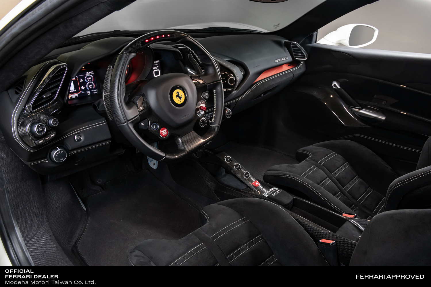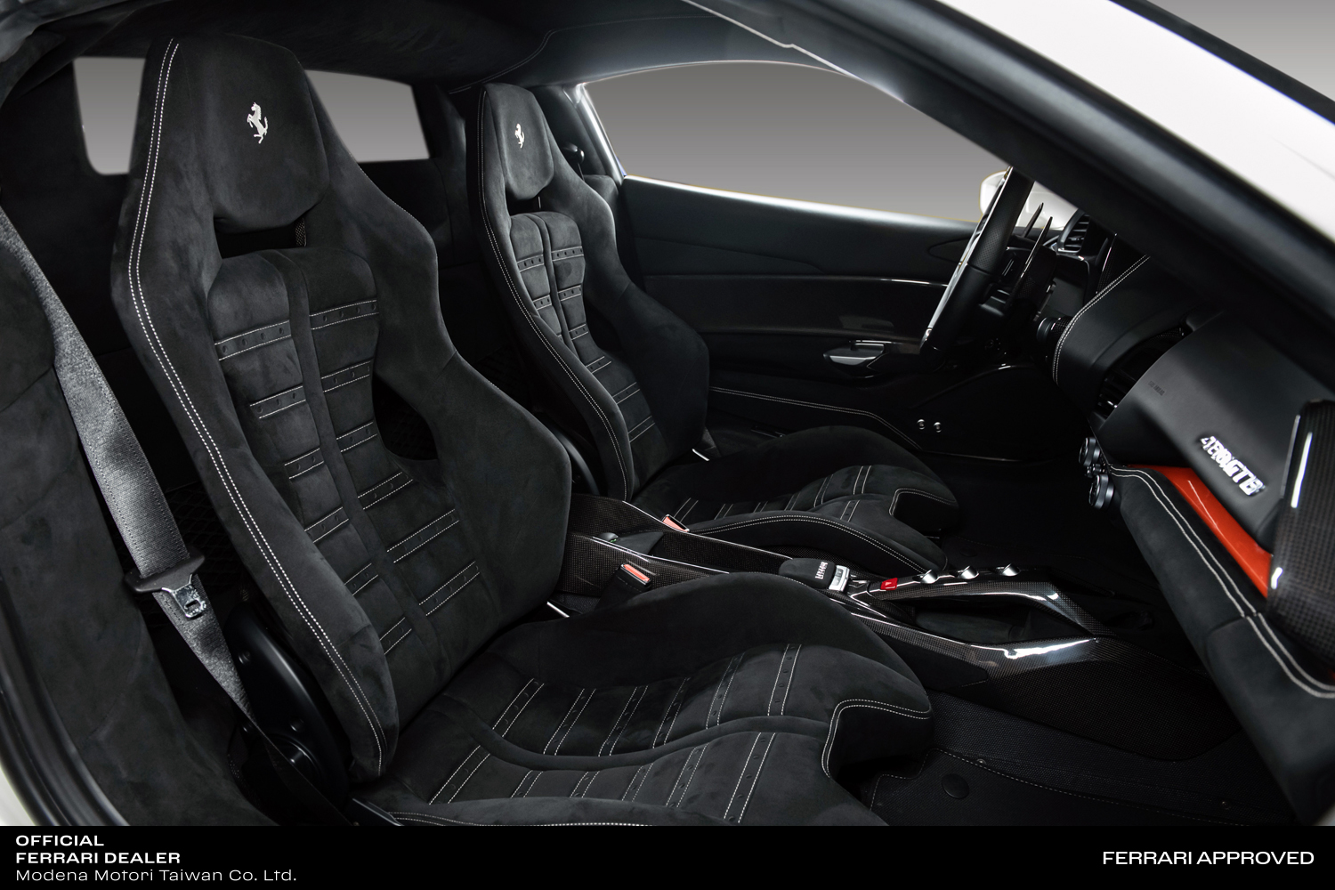 - 復刻 GTO 的賽車化內裝,選用了碳纖維製作的排檔鞍座、碳纖維中央扶手、碳纖維鑲飾門板與碳纖維門檻飾板,且於地板鋪上黑色特殊纖維材質的地毯,以及一支附 LED 超轉燈的半碳纖維/半真皮三輻式方向盤和碳纖維換檔撥片,並在防火牆上一樣嵌有全球唯一的車型專屬銘牌。