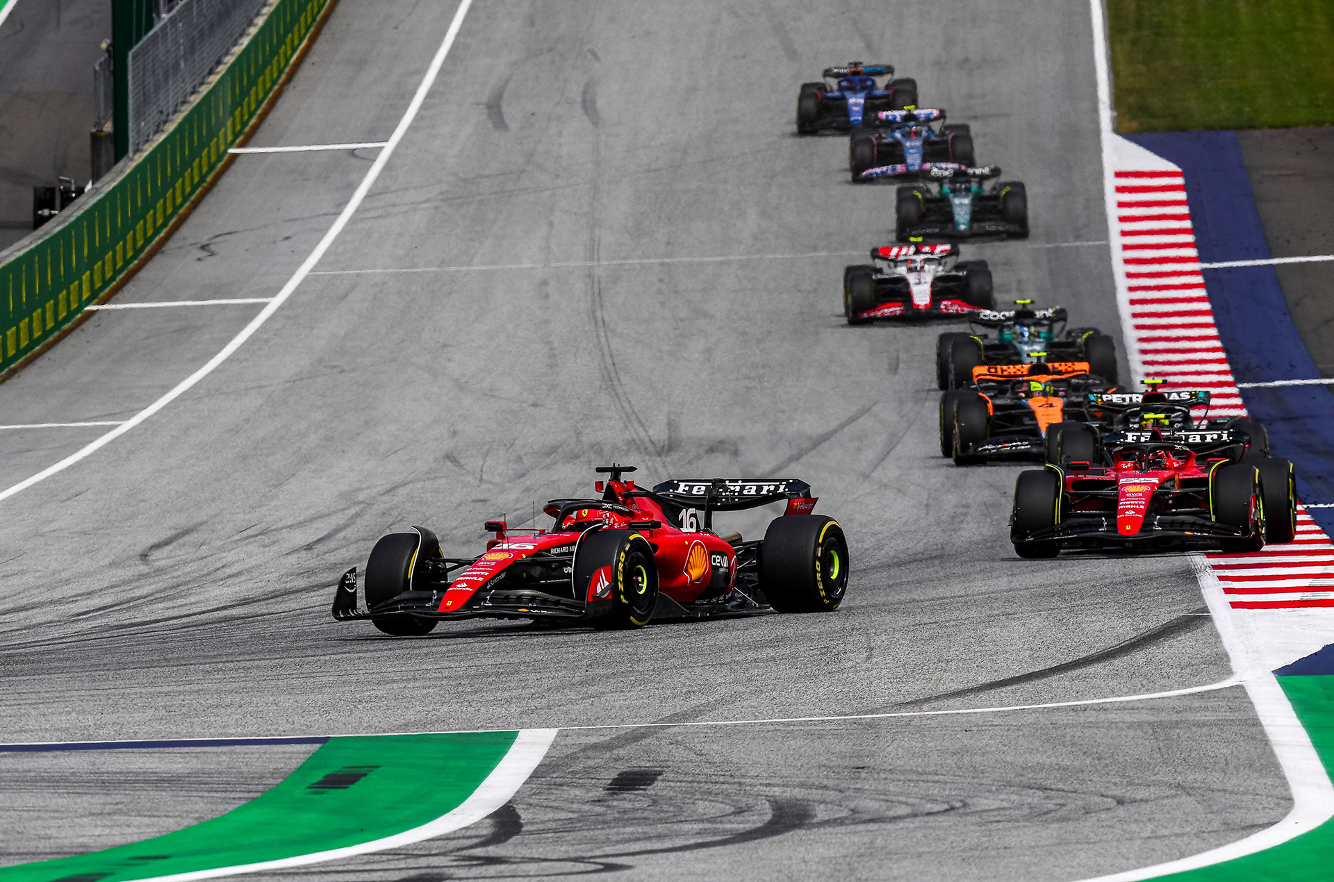 經典的五個起跑紅燈逐一熄滅那刻兩輛躍馬車手奮勇突圍,Charles Leclerc甚至在進入二號彎之前已經與領先車手並行,一邊給予對手壓力一邊準備進入彎道,不過可惜的是對方佔據賽道內線,使得摩納哥車手無法順利完成超越,起跑瞬間超越的劇本不奏效之後,兩位躍馬車手穩穩地守住第2與第4的位置。