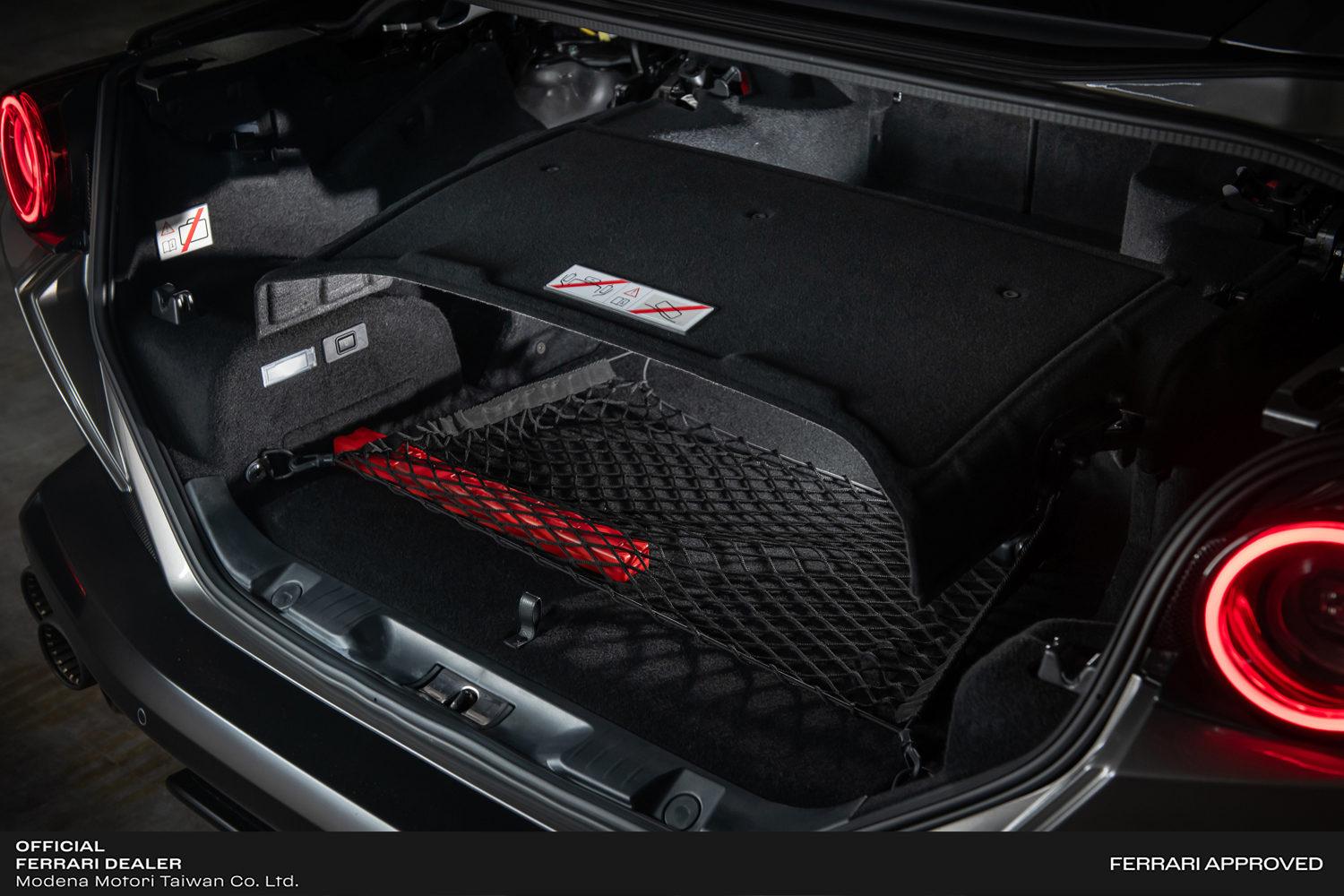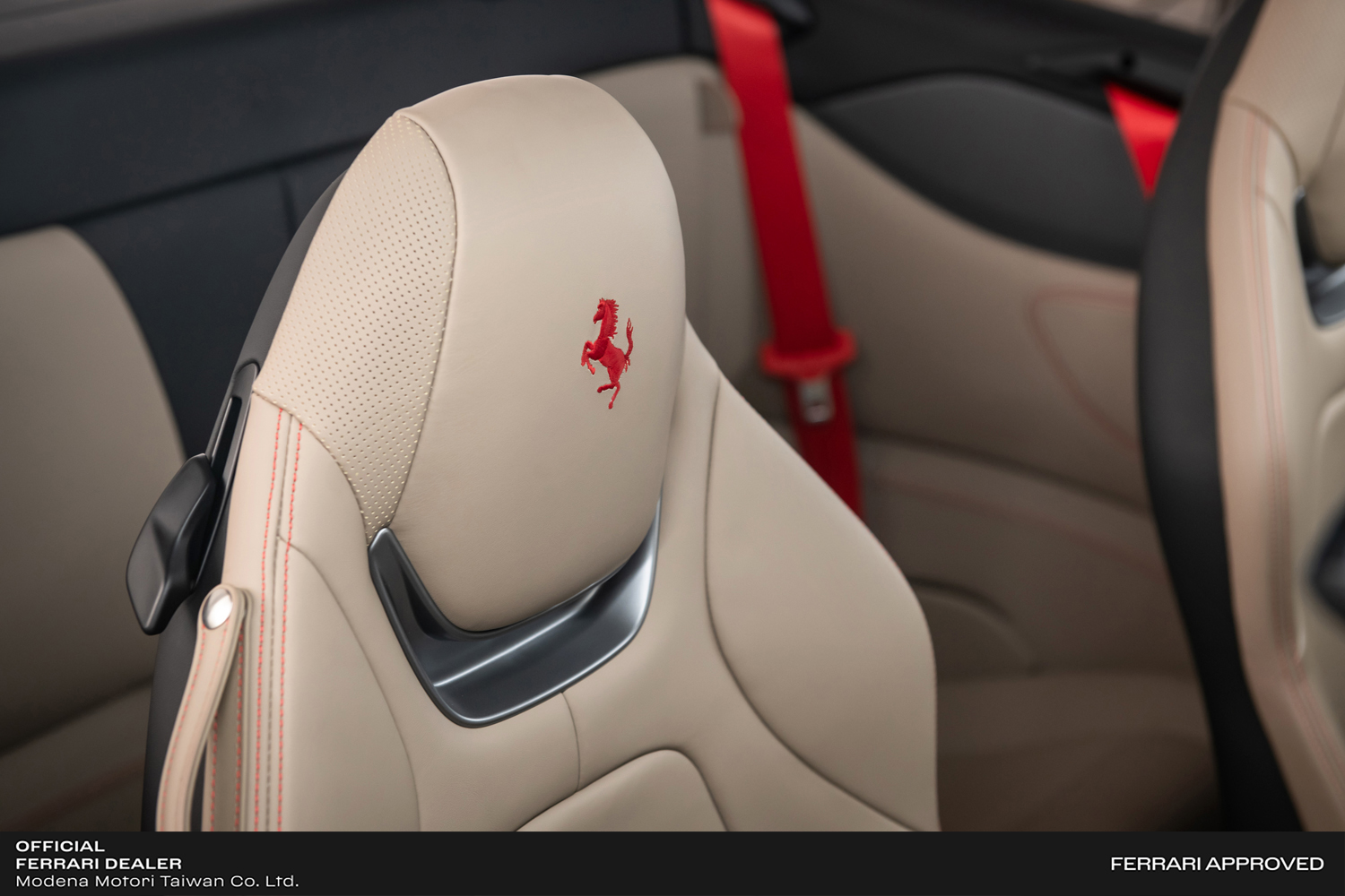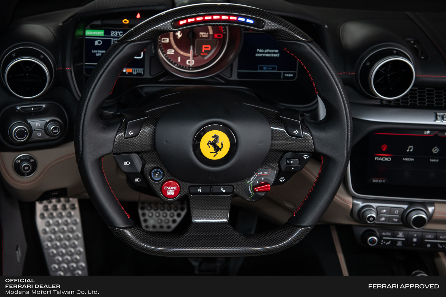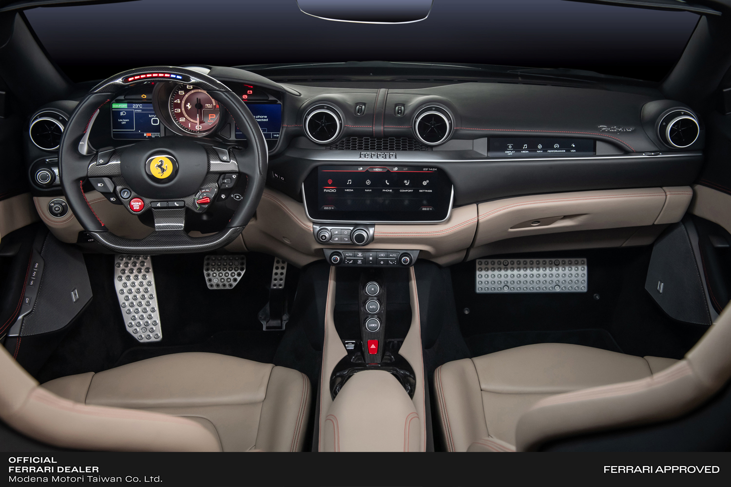 - 擁有10.25英寸螢幕的多媒體娛樂資訊系統,以及全新的空調系統及全新方向盤,加上18向電動調整的座椅可為後座乘客帶來更寬闊的腿部空間。Ferrari Portofino也配備全新導風板,可減少車內30%的氣流流動,有效降低行駛時的噪音。