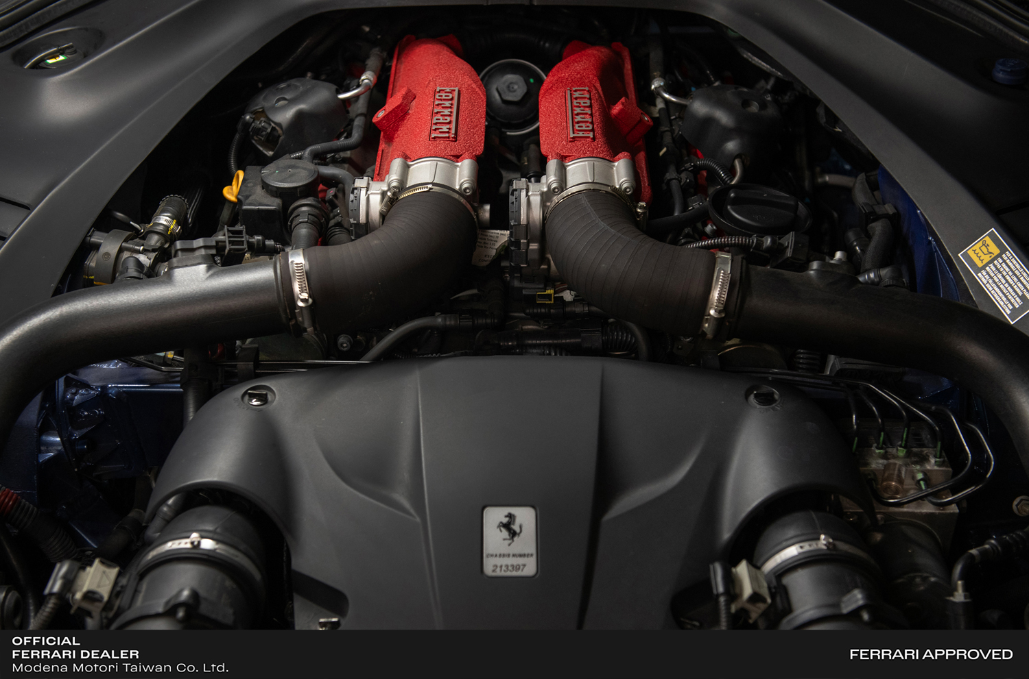 - 坐擁2016國際引擎大賞四大獎項背書的3.9升法拉利V型八缸渦輪鉅作F154CB引擎與源自Ferrari FF的七速雙離合器變速箱,擁有較前作大幅成長了一百匹之譜的馬力輸出,77公斤米的扭力更可以在三檔到七檔間從2750rpm起持續供給直到紅線,實現不亞於自然進氣十二缸引擎的絕對性能表現。
