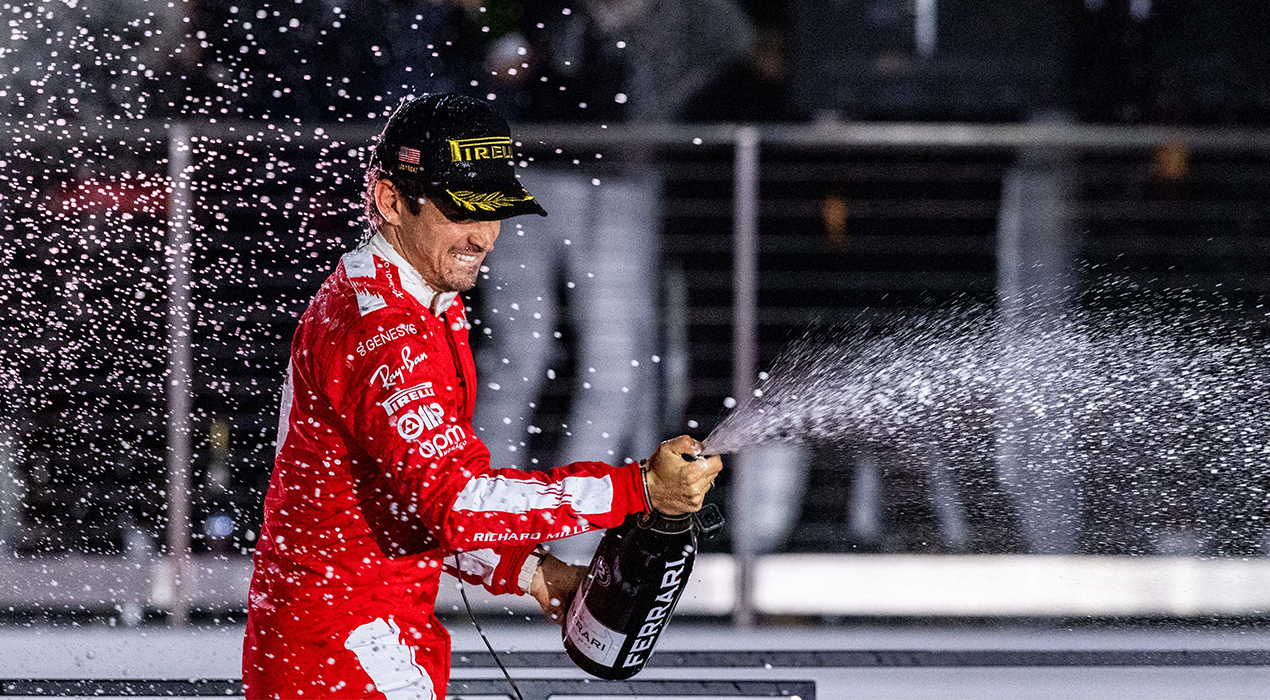 比賽倒數第二圈中Charles Leclerc嘗試晚煞車而一度丟失第二名位置,但在最後一圈的最後一彎前的大直線上,這位摩納哥天才車手以354km/h的速度及承受超過7G的重力,硬生生地將對手超越,冷靜地將亞軍寶座要了回來,而直到衝線之前兩名車手的差距仍然在1秒以內,在絢爛娛樂之城的夜間賽事目睹如此激昂高速的近身肉搏與超越,絕對是2023年拉斯維加斯大賽最為精彩的一幕。