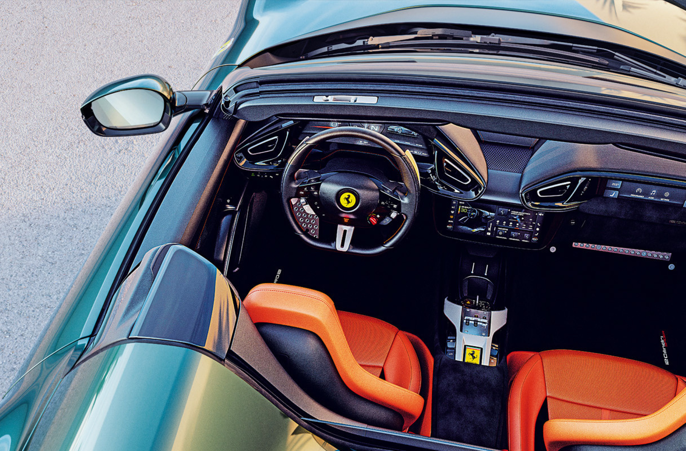 這款車型優雅與運動造型之間的基本平衡也體現在其內裝設計上。 跑車內裝設計主管Fabio Massari 說:「為了最好地表達車型的『雙重靈魂』,我們致力於在材料和飾面上進行了充分研究。」12Cilindri大膽的將駕駛艙一分為二,使概念提升到了新高度,同時在儀錶板中央整合了一個精美的集成式第三數位螢幕,供駕駛和乘客使用。