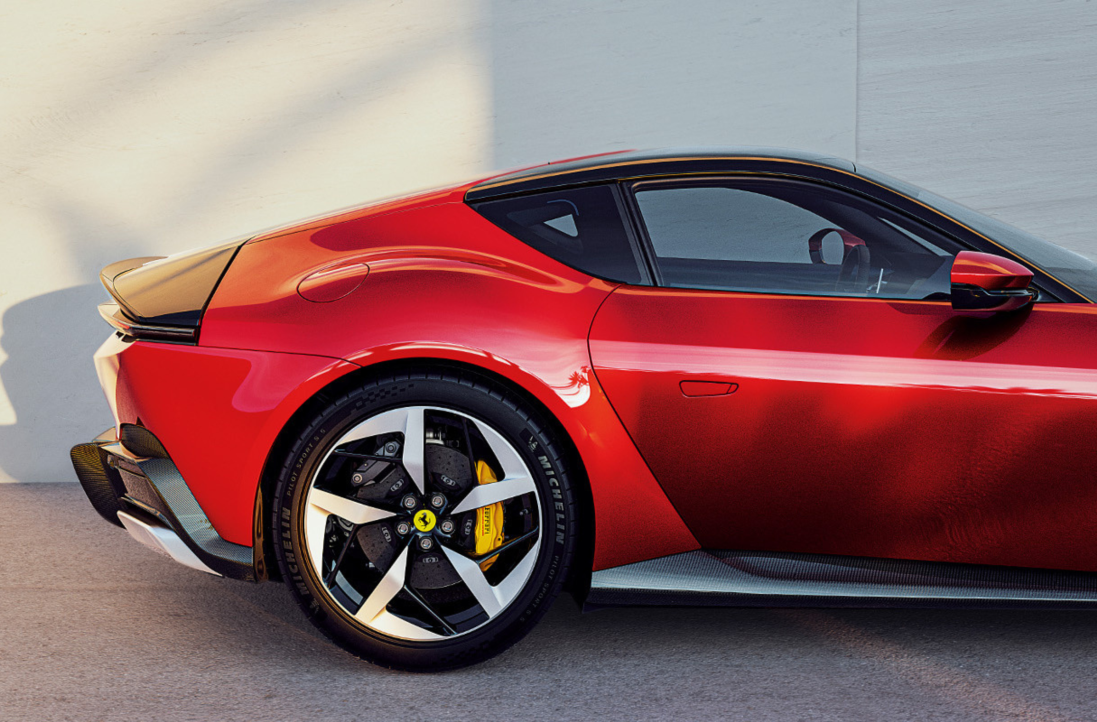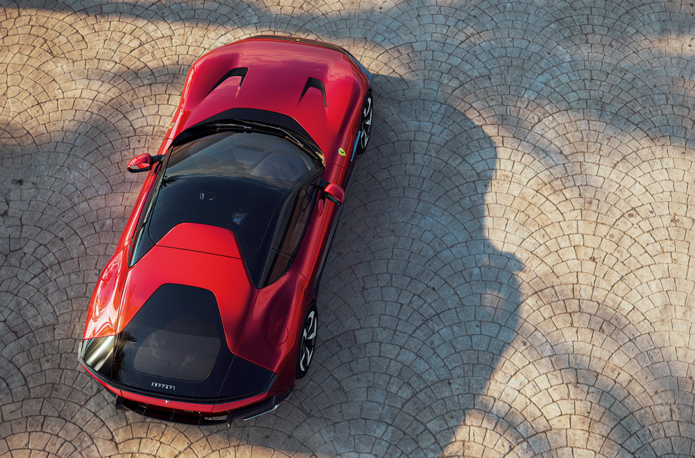這款雙門轎跑車的座艙部分向上延伸的方式特別引人注目,其車頂和側角窗的三角翼圖案融為一體。對於12Cilindri Spider而言,兩個醒目後扶壁突顯結構感,其中的黑色元素與轎跑車的三角翼形狀相呼應。