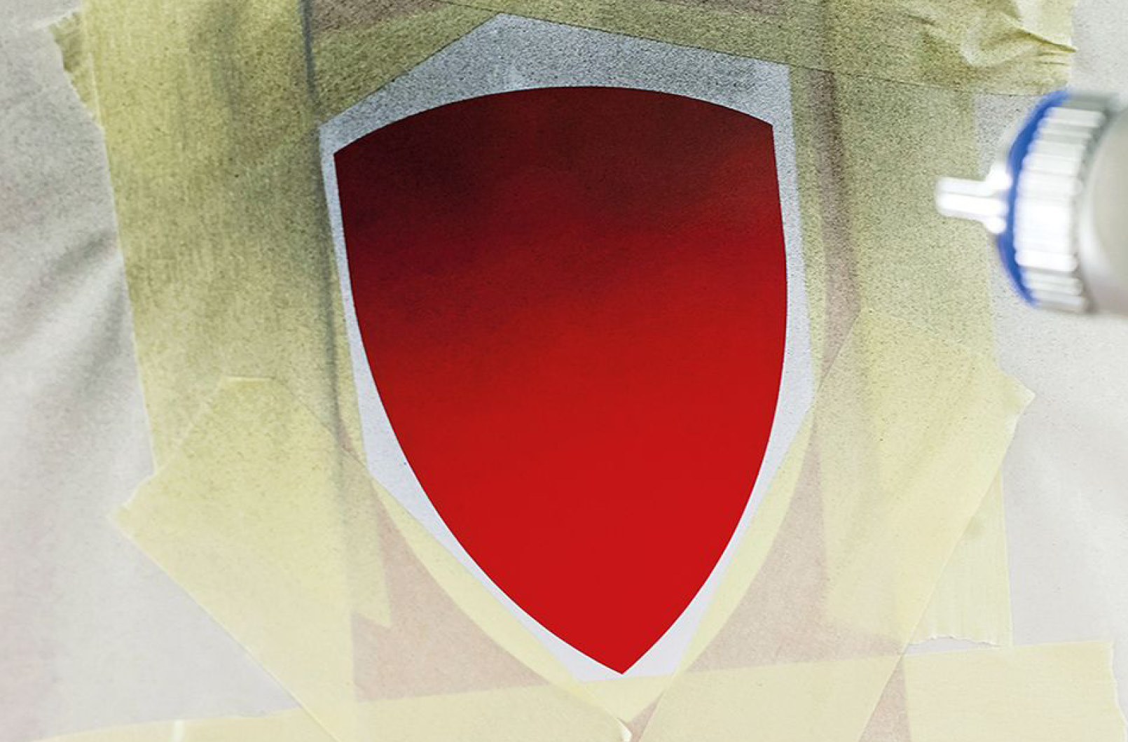 過程中從使用模具開始,引導噴漆工匠將徽章固定在前葉子板位置。由於模具也以手工黏貼,因此需要運用到另一個義大利語名為「dima」的特殊模具,將該模具放在擋泥板上,可以使scudetti徽章定位在同一位置。模具放置到位後,在塗上每一層油漆時,再使用手術工具將模具逐一清除。這個過程並非只是在車身上噴漆那麼簡單:每個塗層步驟都需要噴上一層油漆及保護漆。塗漆過程從塗黑色開始,接下來上Giallo Modena的黃色,然後塗上意大利國旗的紅色和綠色。由於兩者不重疊,因此必須一次將兩者繪製在一起 並分別塗上透明塗層。接著,對所有剩餘的油漆層重複整個過程,最後使徽章乾燥。