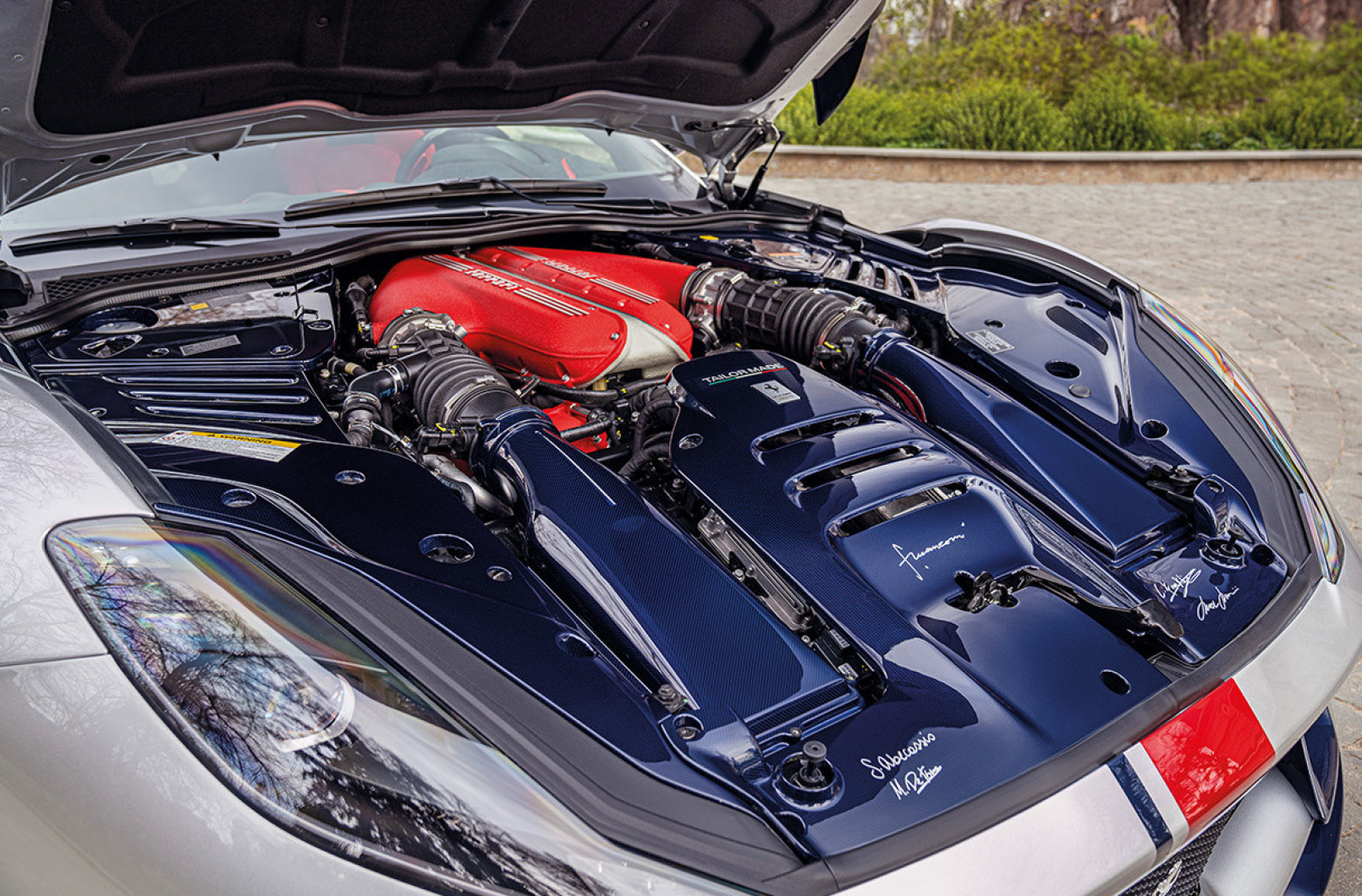 橫越車身的紅色線條以一條細長的金屬藍色條紋作為輔助在陽光下非常搶眼。這是Fernando Solís增強Tailor Made藍色碳纖維外觀套件所做的完美補充,包括引擎蓋的「迴旋鏢」造型、前進氣口、側裙和後擾流板。打開引擎蓋,另一個純粹的戲劇性場景出現在眼前:整個引擎艙內部都是使用藍色碳纖維材質。