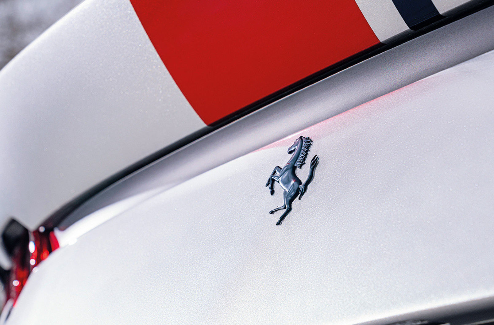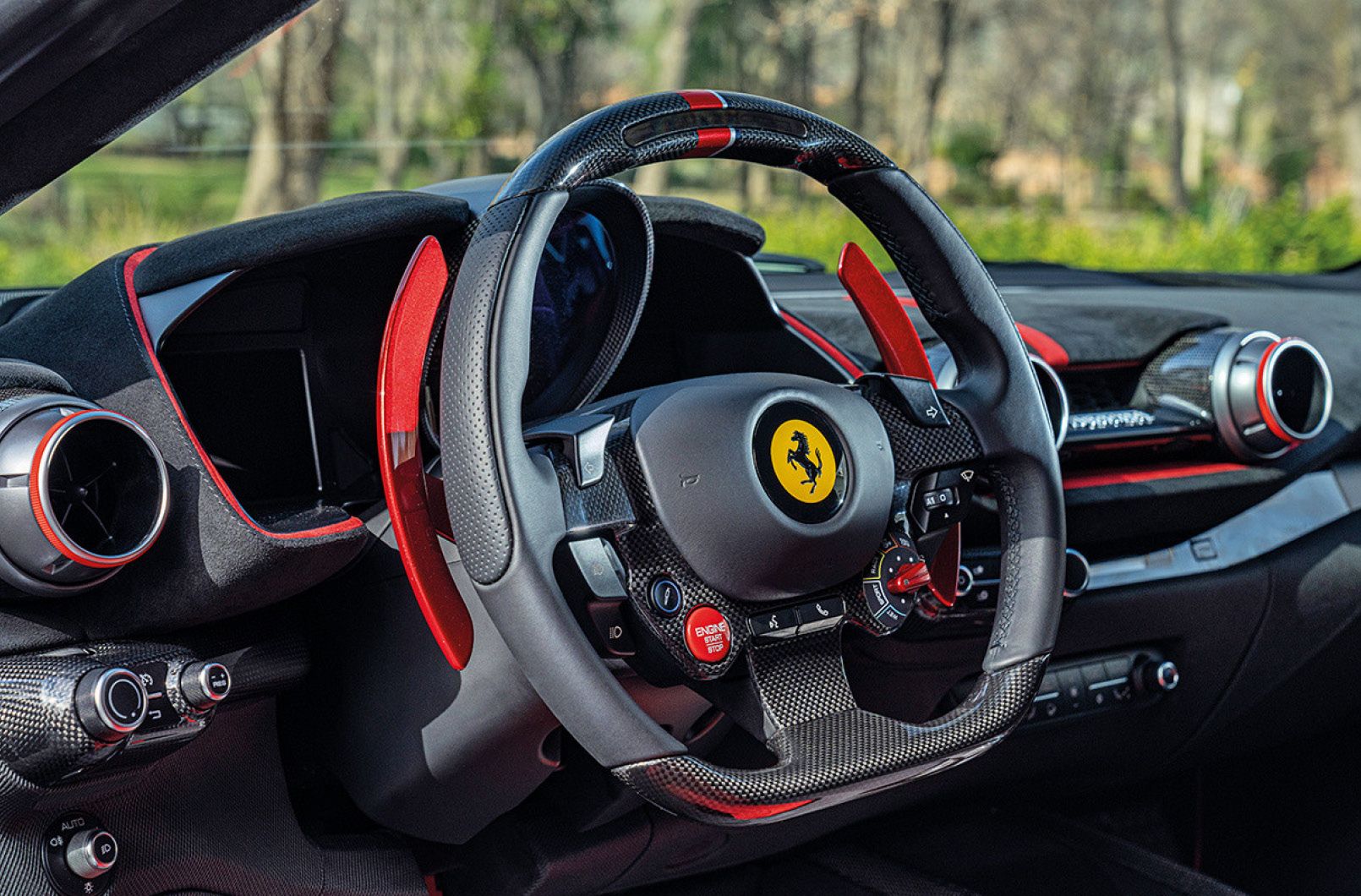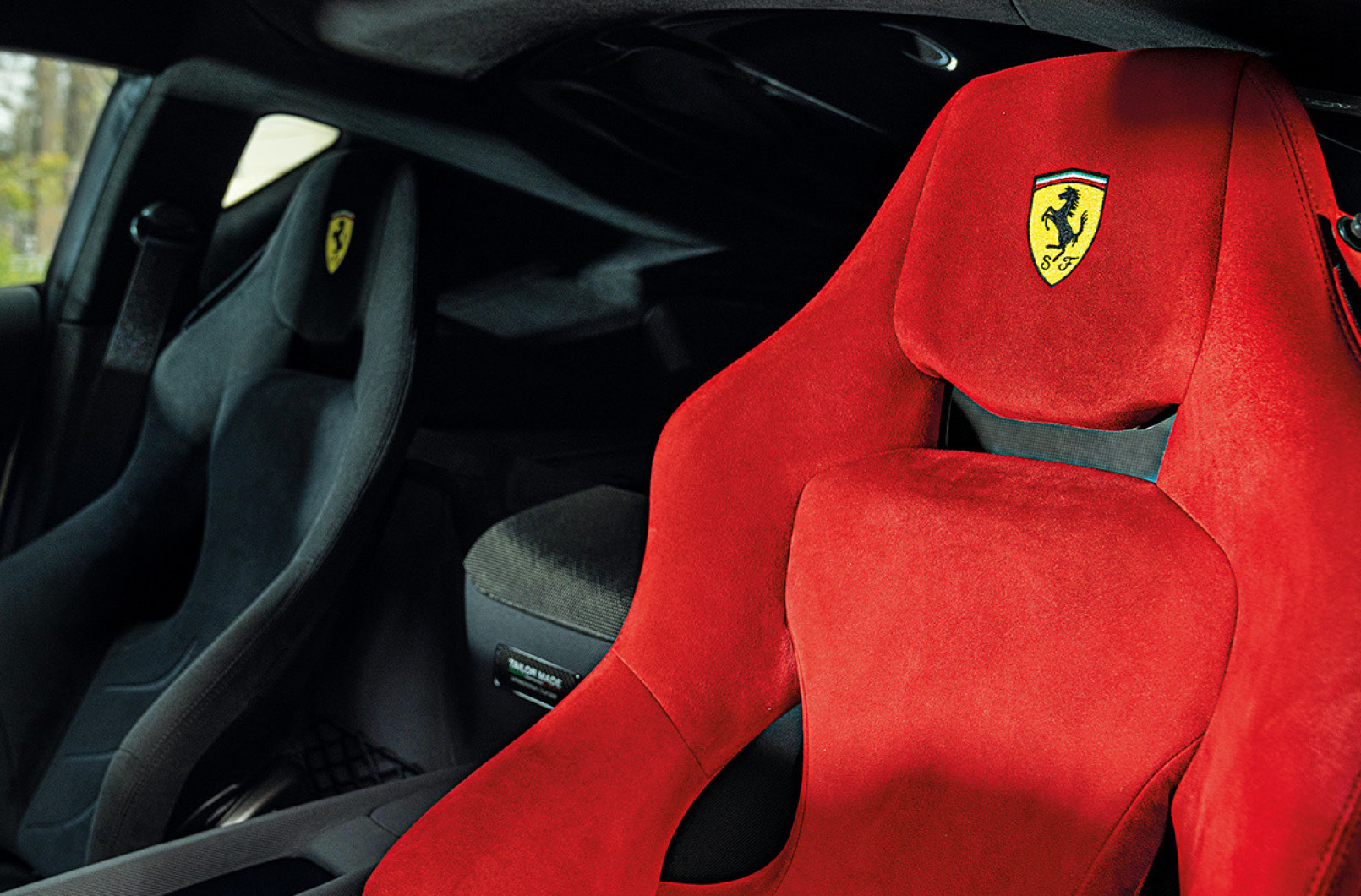 首先映入眼簾的是駕駛座和乘客座之前的對比:駕駛座使用Rosso FX Alcantara®,而乘客座則是黑色的Alcantara®。這種對比在門把手上得到了呼應-駕駛座是紅色,乘客座則是黑色,這個主題也延續到了換檔撥片上。