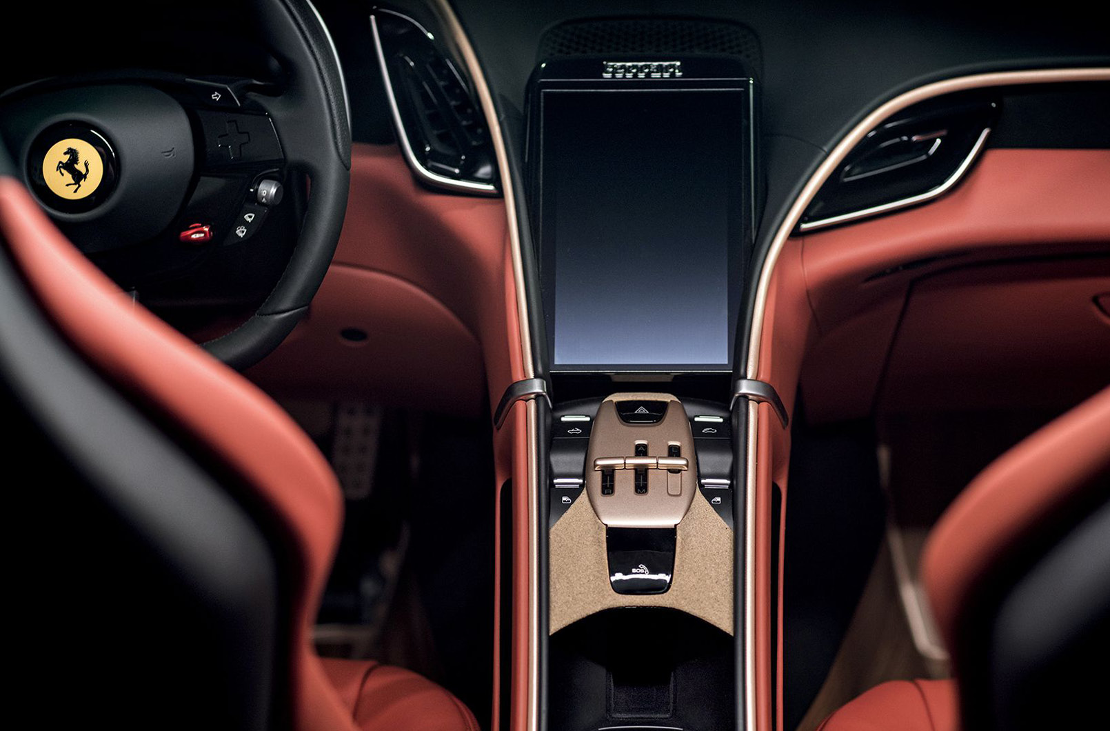 Ferrari Tailor Made 的精湛技藝在整車細節中得以充分展現,包括使用無鉻的 Nappa 皮革和經過可控來源的木材,打造車頂篷及地板。兩側前葉子板上的盾型紋章,象徵著首次在鋁合金車身組件上實施雷射雕刻,該車頭處則刻有Maranello地理位置的座標,增添了獨特而深邃的魅力。