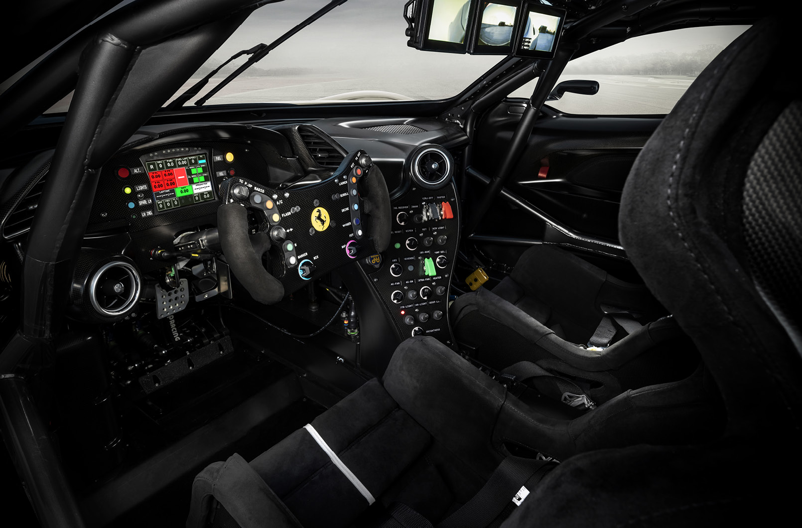 車身使用一種專門調製的四層鋁漆塗裝Gold Mercury,漆料中的液態金屬使車身在陽光照耀下,根據不同角度的色彩變化,呈現迷人的視覺效果。座艙設計簡約,除了門板和乘客側的儀表板外,駕駛艙設計與Ferrari 488 GT3保持一致。Ferrari KC23的專屬座椅使用Alcantara©材質,完美襯托專注細節的內裝和優雅的外觀。