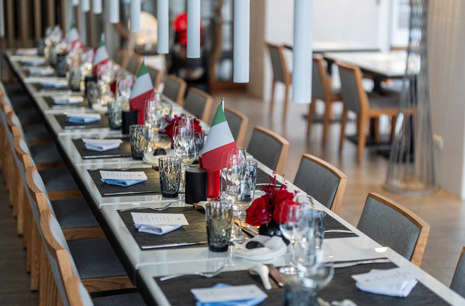 午宴場地精選墾丁一處靜謐典雅的餐廳,特別布置的躍馬氛圍與主廚量身設計的客製化菜單,以義式風味為靈感,結合Ferrari對細節的極致講究,於每一道料理中精緻展現。現場佈置融入品牌經典色彩與優雅元素,從餐桌花藝到光影層次,皆精心設計,完美體現Ferrari一以貫之的義式格調與品味。