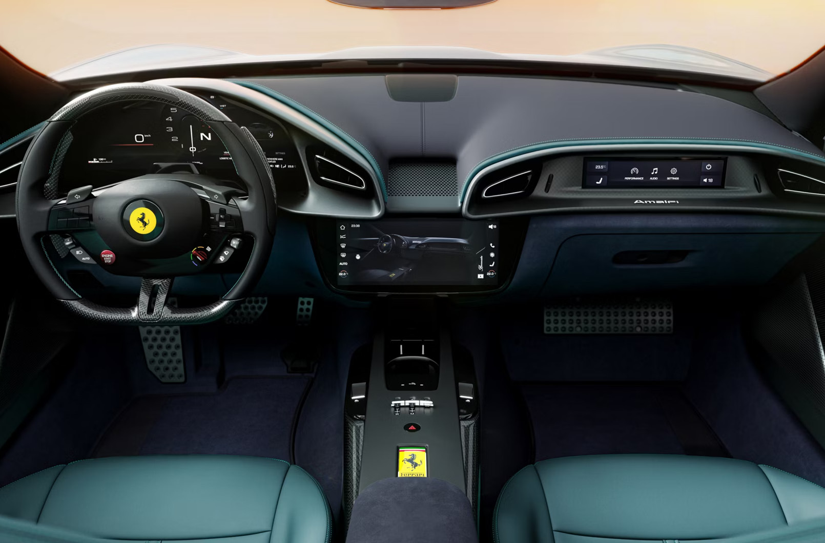 車內採用雙座艙佈局,巧妙打造駕駛與乘客的專屬空間,並配備全新升級的人機互動介面系統。該車配備三個數位儀錶板,包括一個15.6吋的數位儀錶板、一個10.25吋中央觸控螢幕,以及一個8.8吋乘客專屬螢幕。全新設計的方向盤也回歸到實體按鍵方式。與外觀相同,Ferrari Amalfi內裝也秉持簡潔、現代感的風格。