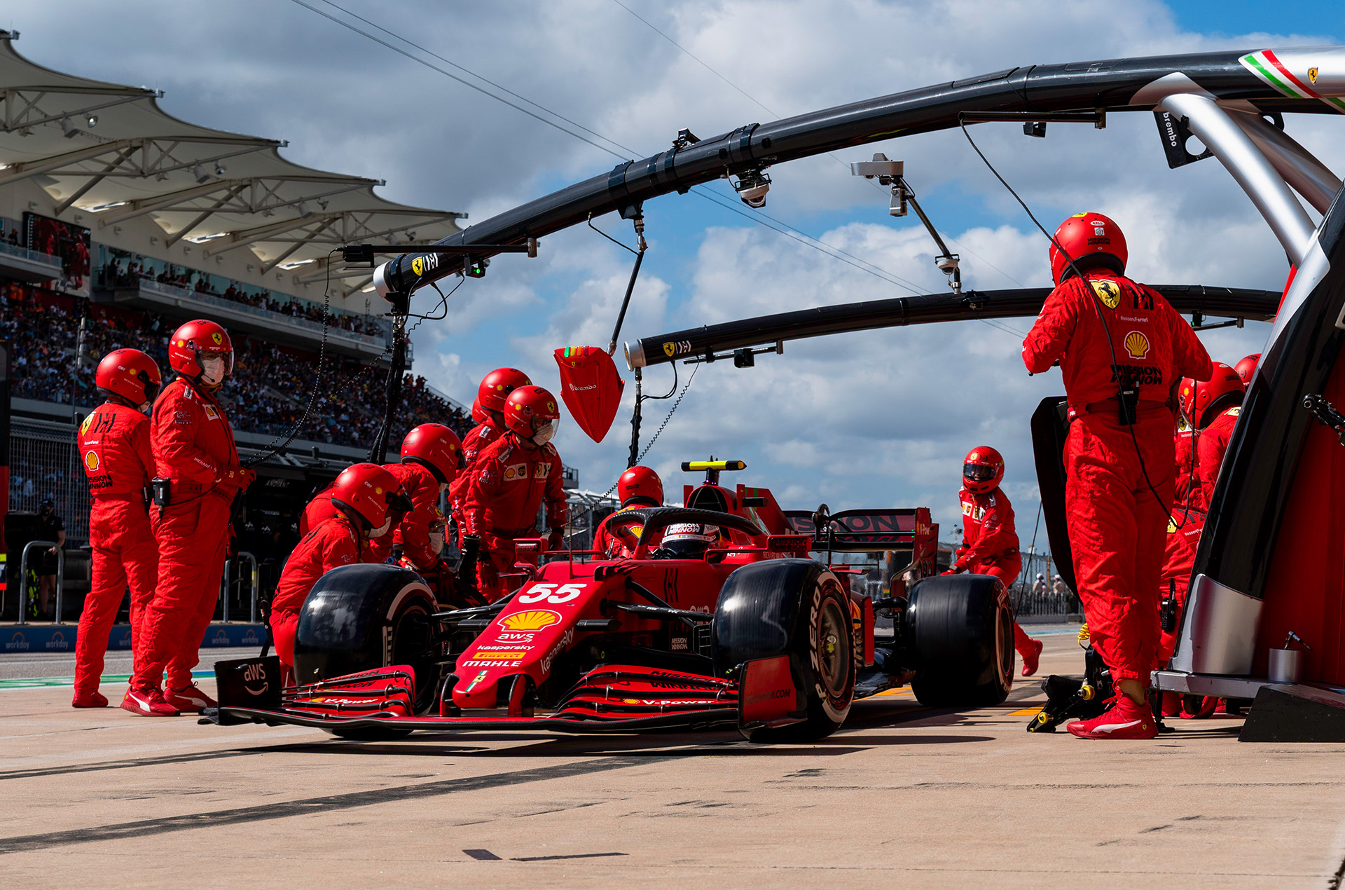 第一圈激烈爭搶後比賽開始進入穩定階段,與其進行莽撞的挑戰,Scuderia Ferrari法拉利車隊與Charles Leclerc選擇固守在第四名的位置,以確保本站賽事車隊積分能最大化,到了比賽第11圈,採用紅色軟胎起跑的Carlos Sainz Jr.進行第一次換胎。值得讚賞的是,這次進站車隊僅花2.2秒就完成四條輪胎更換,兩圈後Charles Leclerc換胎程序也是在2.7秒完成,兩位車手換胎作業均能在3秒內完成,顯示這並不是靠運氣而已,而是車隊同心協力及無數次的練習才能達成。