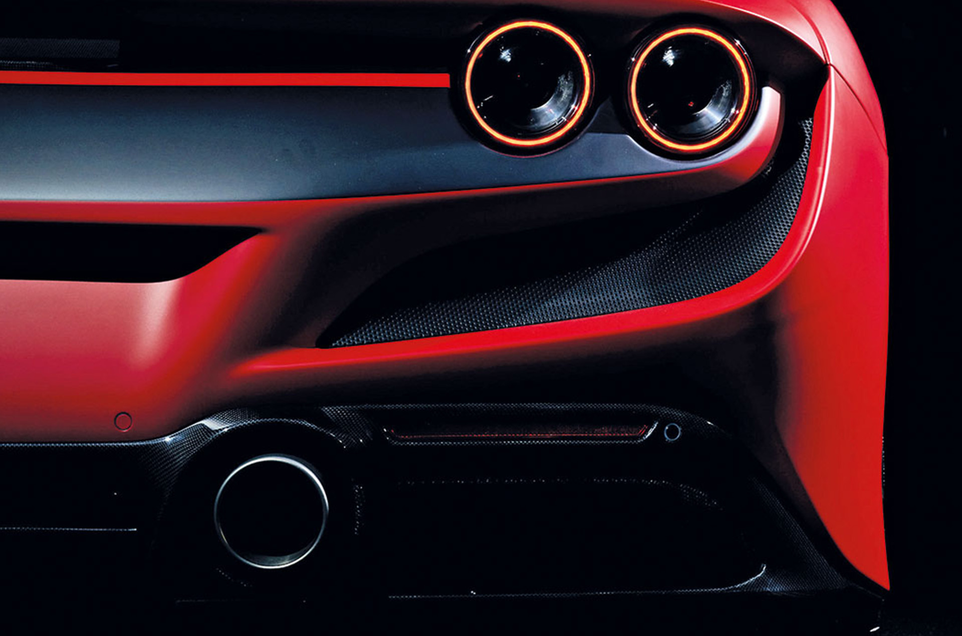 外層塗料選取了Ferrari法拉利經典色的消光版本 – Rosso Corsa Opaco,與運用了Nero DS 1250 Opaco的消光黑車頂使整體相得益彰。為了防止整體效果過於激進,輪圈則採用了Grigio Corsa色調,以便保留其細節,同時外觀的亮面碳纖維用於襯托消光的內裝。
